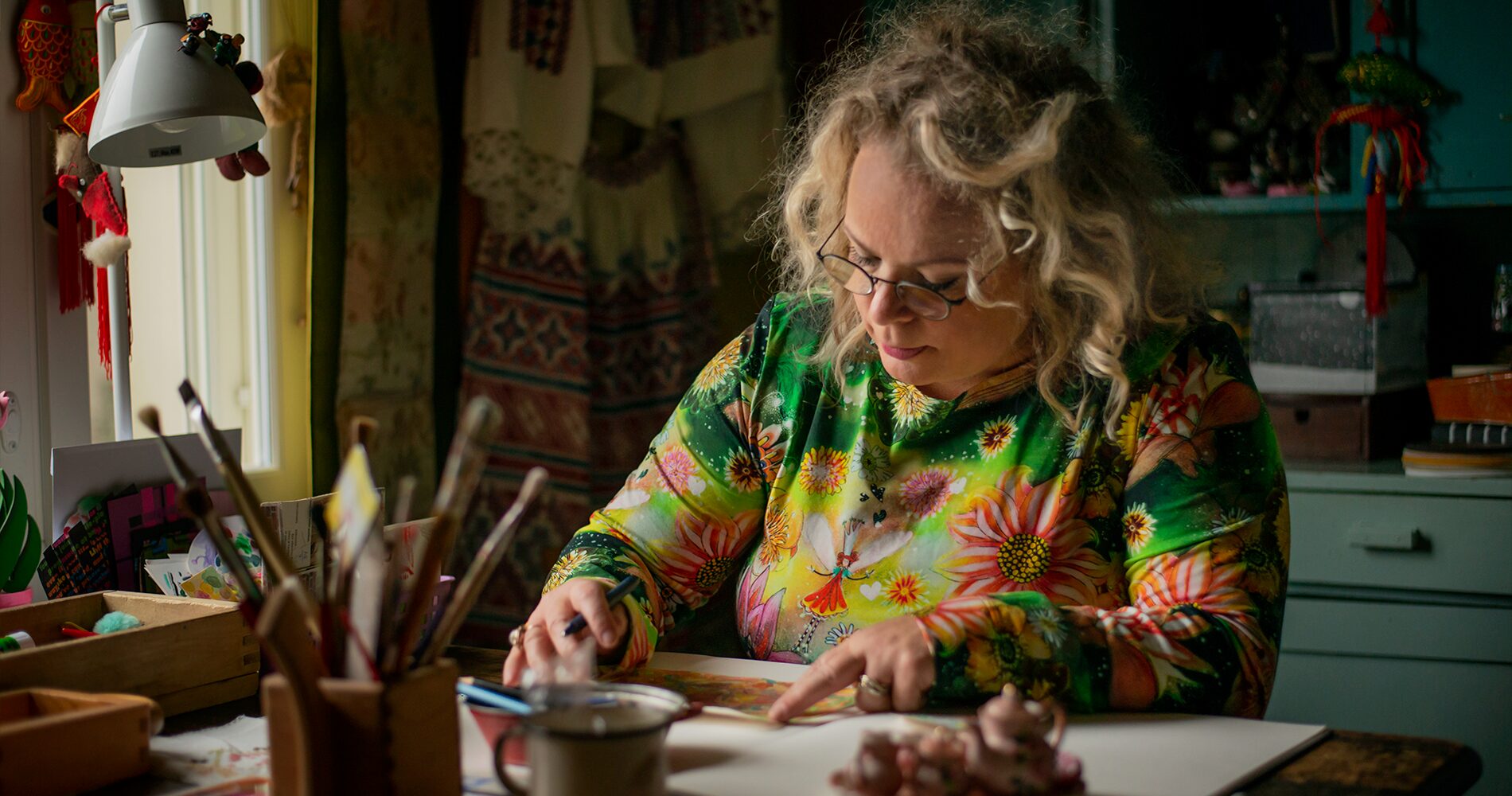 Each ceramic figure has its own story – full of details, expressive characters, and fairytale-like magic. The hand-shaped and painted figures bring warmth and playfulness to their surroundings, bringing fairy tales to life anywhere as well as in art collections. Many of the characters are familiar from the enchanting illustrations of Pomenia storybooks and colourful murals around Finland. In these works, silliness and joy dance freely, cherishing the power of imagination and the enchantment of fairy tales.