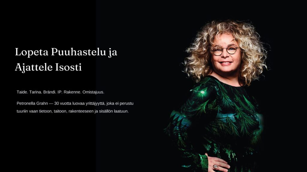 Siksi olen luonut koulutuskokonaisuuden “Lopeta Puuhastelu ja Ajattele Isosti – Menestyksen Salaisuus”. Se perustuu omaan 30+ vuoden kokemukseeni brändien rakentamisesta ja luovuuden kaupallistamisesta. Olen mm.